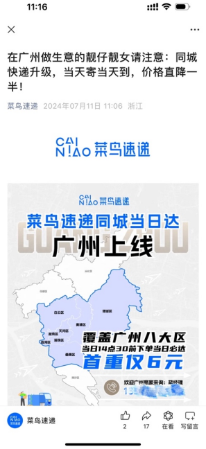 7月11日,菜鳥速遞在公號上推送的消息顯示,菜鳥速遞在廣州面向商家升級同城快遞服務(wù),提供同城半日達(dá),當(dāng)天14點(diǎn)30分之前的訂單,均保障當(dāng)天送達(dá)。時效大提速的同時,無論首重還是續(xù)重,價格打了5折。