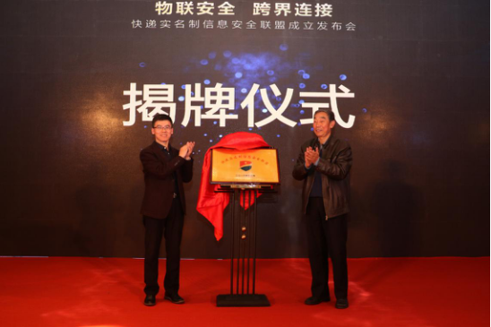 原國家郵政局政策法規(guī)司司長,中國快遞協(xié)會原副會長兼秘書長達瓦(右) 信息安全聯(lián)盟常務(wù)副主席李勇虎(左)共同為聯(lián)盟揭牌