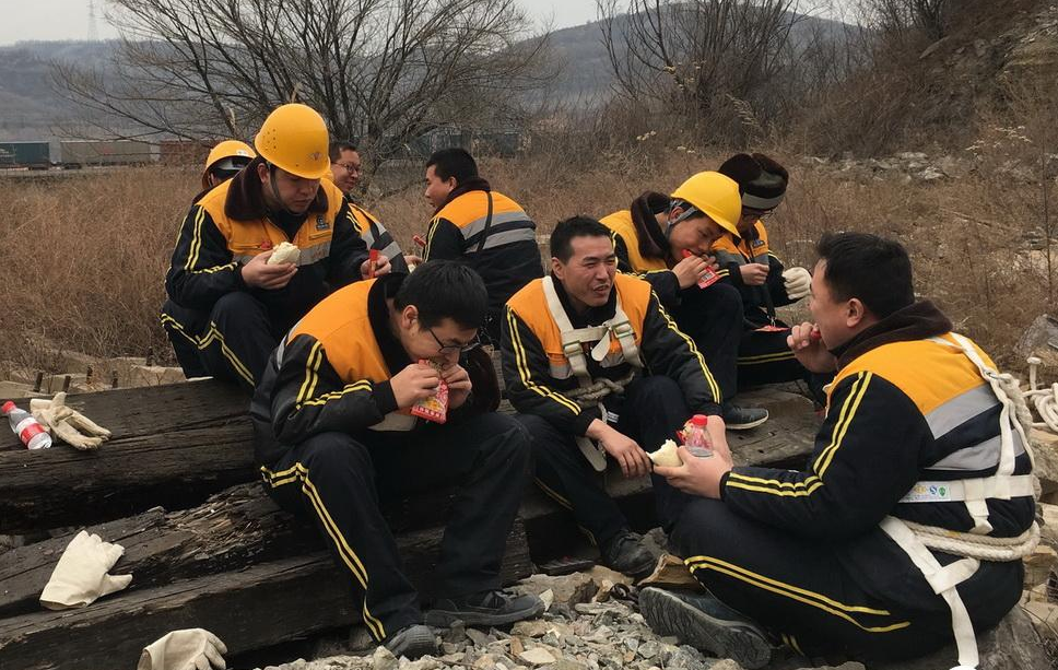 作業(yè)休息期間,延安工務(wù)段富縣橋隧檢查工區(qū)的工作人員席地而坐,他們隨身攜帶的食物是饅頭、榨菜和礦泉水。