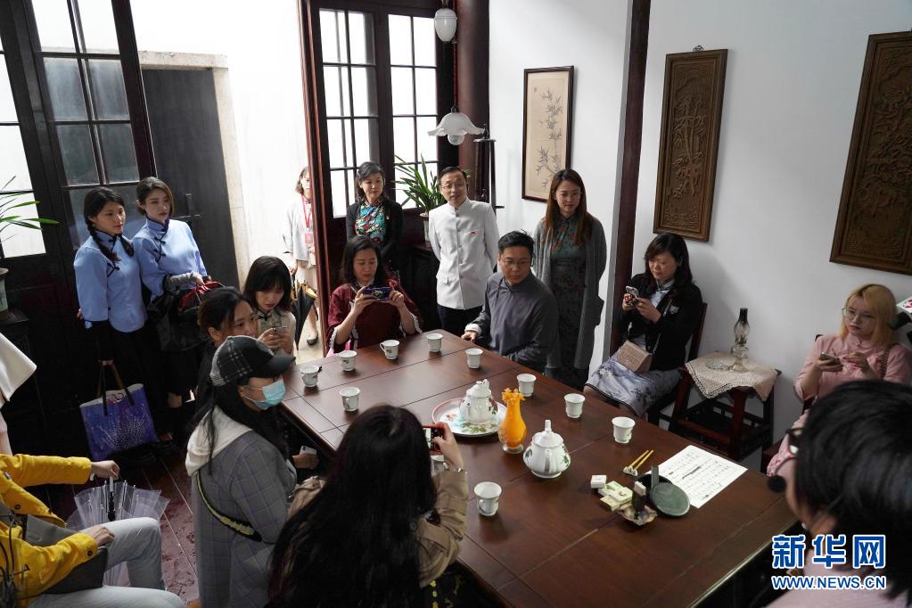 4月27日,有50多年黨齡的徐志英(中)在上影車墩影視基地乘坐“初心號(hào)”紅色巴士,重溫黨史。