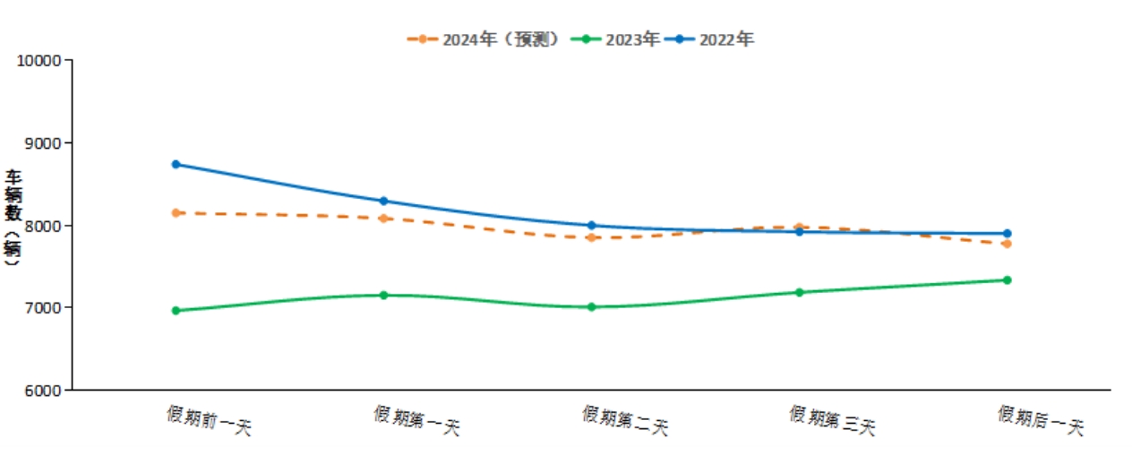 預(yù)計普通公路日均斷面交通量約為7970輛,較2023年增長約12%,如圖2所示。元旦假期普通公路斷面交通量相對較為平緩,高峰現(xiàn)象不明顯,放假前一天為峰值,約8150輛,第二天至第三天平穩(wěn)運行,假期后一天交通量回落。
