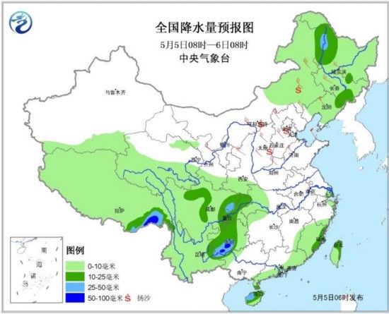 全國降水量預(yù)報圖(5日08時-6日08時)