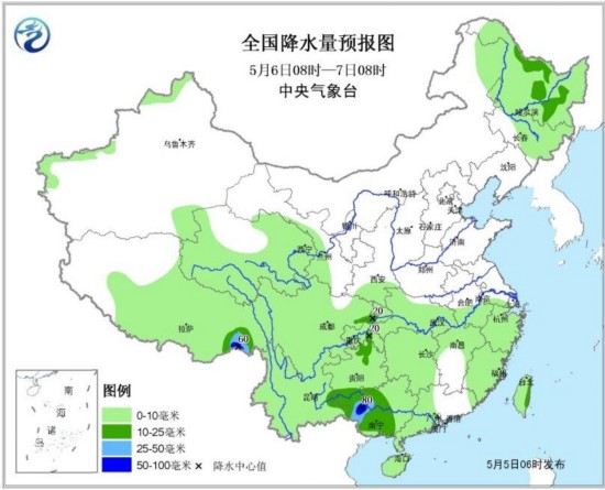 6日08時至7日08時,廣西西部、重慶及黑龍江中部等地的部分地區(qū)有中到大雨,其中廣西西部局地有暴雨(50~80毫米)。內(nèi)蒙古中東部、東北地區(qū)中部等地有4~6級風(fēng),陣風(fēng)8~9級。