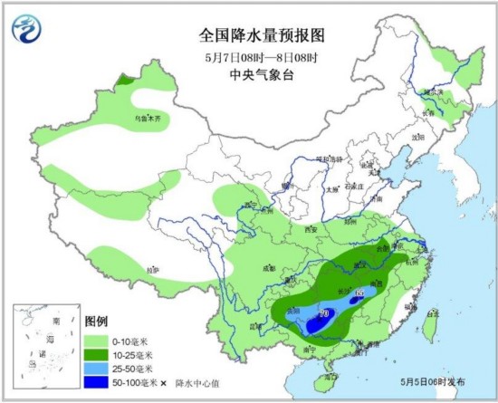 7日08時至8日08時,江漢東部、江淮西部、江南中西部、貴州及廣西北部等地有中到大雨,其中廣西北部局地有暴雨(50~70毫米)。