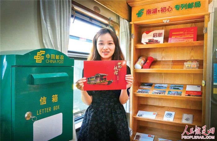 旅客展示車廂內(nèi)的“南湖·初心”列車郵局和紅色書(shū)籍讀書(shū)角。吳少妮/圖