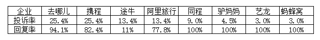 數(shù)據(jù)顯示,各省份旅游投訴中,涉及云南的投訴最多,占全國各省份旅游投訴量的34.8%,北京排第二,占10.9%,上海和廣東并排第三,各占8.7%。在線旅游企業(yè)投訴中,涉及攜程和去哪兒的投訴最多,各占在線旅游企業(yè)投訴總量的25.4%,途牛旅游網(wǎng)和阿里旅行·去啊(13.4%)并排第三。其他被投訴的企業(yè)還有同程旅游、驢媽媽旅游網(wǎng)、藝龍旅行網(wǎng)、螞蜂窩。本月途牛旅游網(wǎng)回復率較低,為11.1%,同程旅游、驢媽媽旅游網(wǎng)、藝龍旅行網(wǎng)和螞蜂窩的回復率均為100%,螞蜂窩回復耗時最短,平均回復時長為3天3小時。