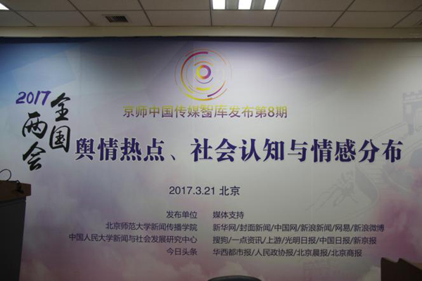 21日晚,由北京師范大學(xué)新聞與傳播學(xué)院、中國(guó)人民大學(xué)新聞與社會(huì)發(fā)展研究中心聯(lián)合《今日頭條》舉辦的 “京師中國(guó)傳媒智庫(kù)發(fā)布”第八期之《2017全國(guó)“兩會(huì)”輿情熱點(diǎn)、社會(huì)認(rèn)知與情感分布》報(bào)告發(fā)布會(huì)在北京師范大學(xué)舉行。