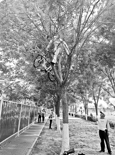 8日下午4時30分左右,5名身穿印有“ofo共享單車”服裝的工作人員趕到事發(fā)現(xiàn)場,其中一名工作人員爬到樹上,隨后與其他兩名工作人員協(xié)作,將掛在樹上的共享單車“解救”下來。