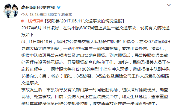 目前,受傷人員正在醫(yī)院接受治療,均無生命危險;肇事重型半掛車駕駛員侯某已被公安機關(guān)控制,該交通事故正在進(jìn)一步調(diào)查處理中。